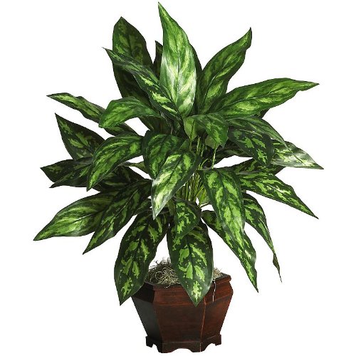 Create a regal environment in your home or office with this lovely silk Silver King. Slender stems adorned with glossy decoratively patterned leaves make this silk plant an ornamental delight. Nearly 2 1/2 feet tall, this stately work of art makes a nice centerpiece or focal point for an otherwise drab office space. A cherry wood vase filled with moss adds a nice warm finishing touch.
